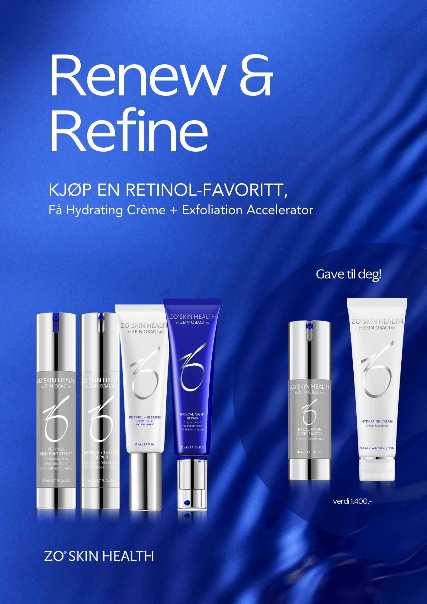 KAMPANJE #1Når du kjøper ditt favoritt ZO Retinol-produkt, får du Exfoliating Accelerator + Hydrating Crème i gave. Denne nøye sammensatte duoen er perfekt for deg som ønsker maksimal glød og hudfornyelse – uten å gå på bekostning av komfort. Exfoliating Accelerator stimulerer cellefornyelsen og forbedrer hudens struktur, samtidig som den øker effekten og toleransen for retinol. Hydrating Crème tilfører intensiv fukt og styrker hudbarrieren, og bidrar til å redusere tørrhet og sensitivitet som ofte kan oppstå ved bruk av aktive ingredienser. Sammen gir produktene en balansert, mer robust hud med synlige resultater og sunn glød – ideelt for deg som allerede bruker, eller ønsker å starte med, retinol i hudpleierutinen. |